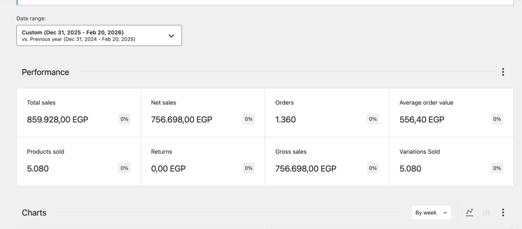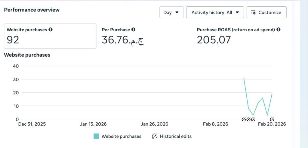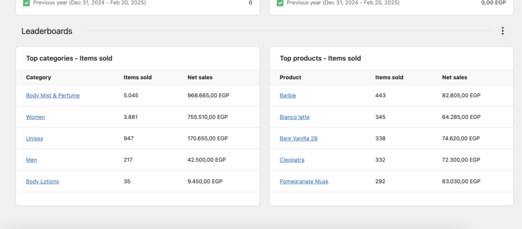 52-Day Performance (Dec 31 - Feb 20): - Net Revenue: EGP 756,698 - Total Orders: 1,360 - AOV: EGP 556.40 - Units Sold: 5,080 - Return Rate: 0% (zero returns) Product Performance Insights: - Top SKU: Barbie (443 units, EGP 82,805) — positioned as playful, confidence-boosting scent - Runner-up: Bianco Latte (345 units, EGP 64,285) — daily luxury positioning - Valentine's hero: Bare Vanilla 28 (338 units, EGP 74,620) — romantic, date-night angle Category Breakdown: - Body Mist & Perfume: 99.3% of revenue (core product strength validated) - Women's segment: 3,881 units (76% of total) - Men's segment growing: 217 units (gifting use case proving out) Campaign Efficiency: - Zero returns across 1,360 orders (product quality + accurate positioning) - Consistent AOV at EGP 556 (bundle offers working) - Peak performance: Week of Feb 8 (Valentine's week spike visible in charts)